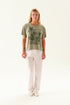 Remera de viscosa con escote redondo manga corta y con estampa en el delantero.