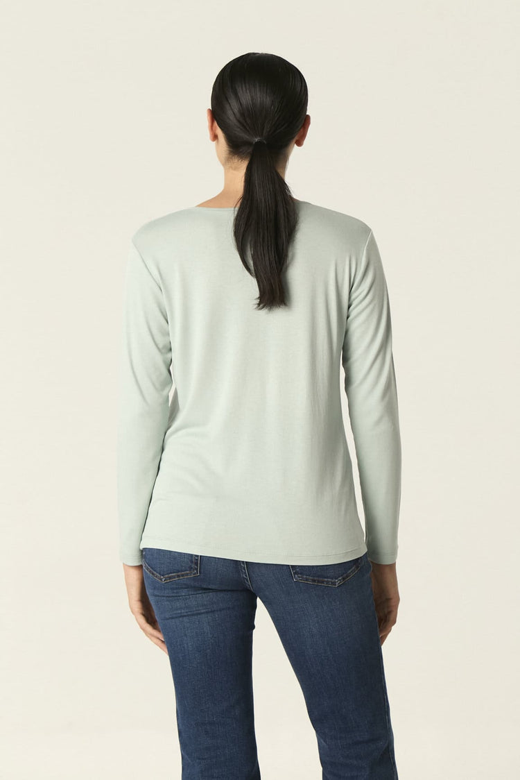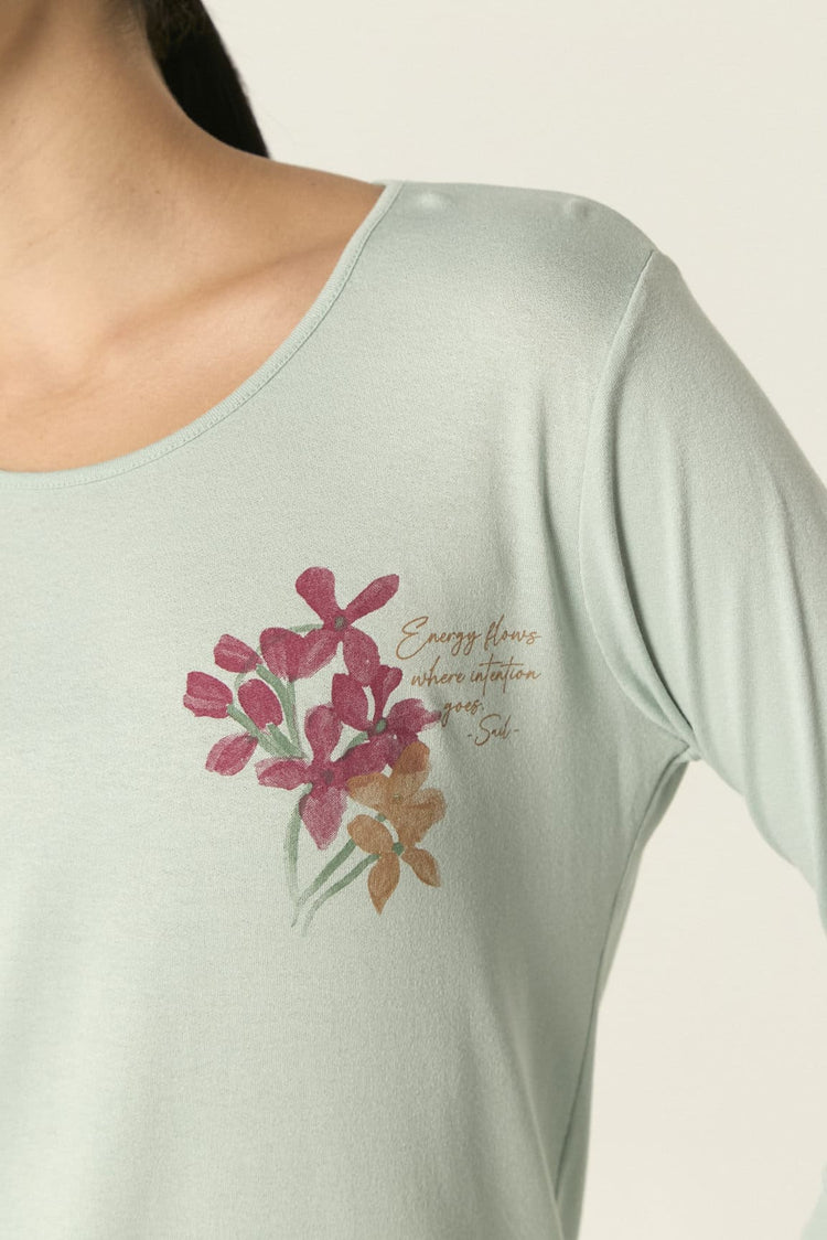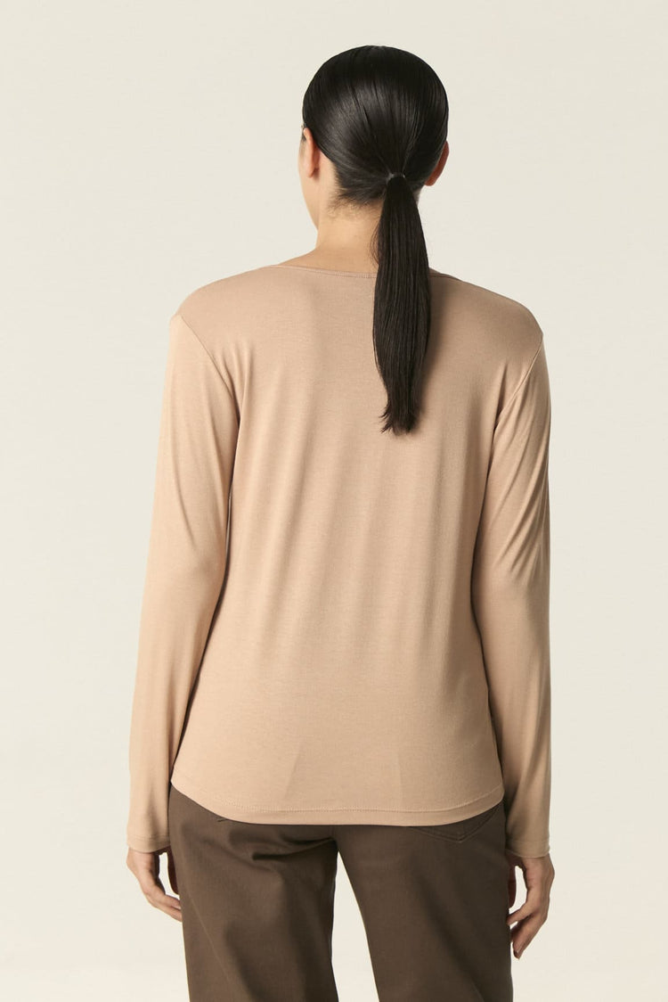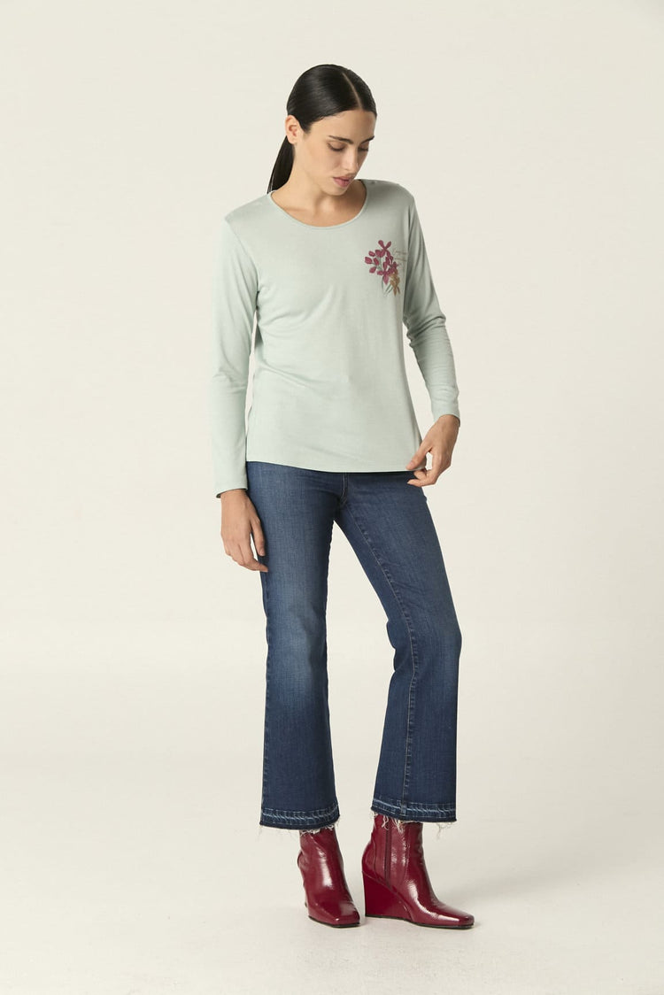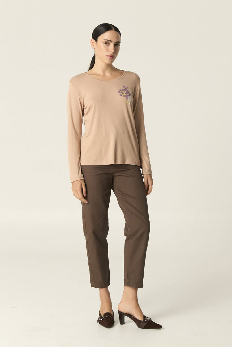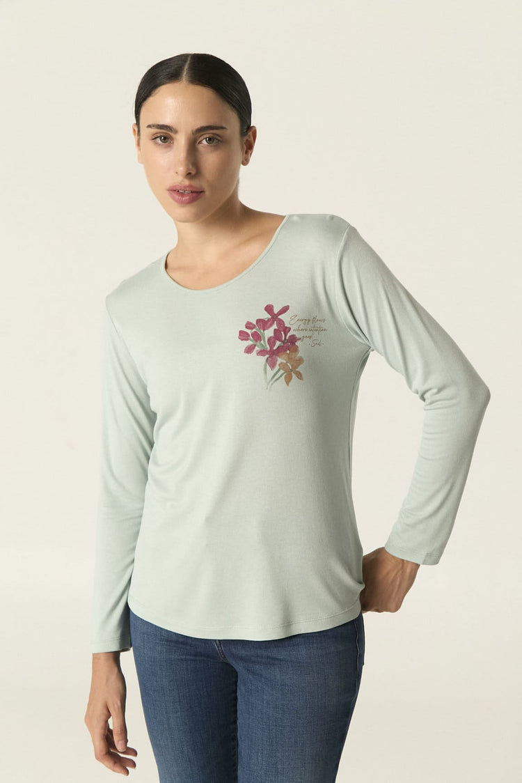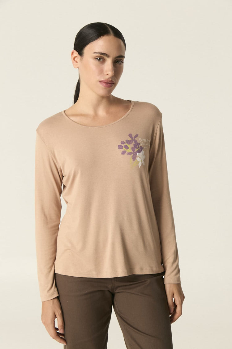 Remera de crepe de punto regular con manga larga con escote redondo. Tiene estampa en el delantero.