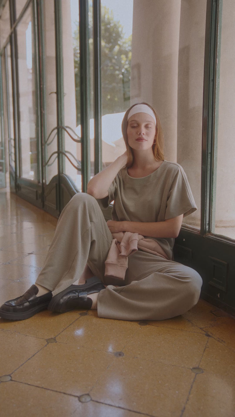 Confeccionada en sarga de punto, esta remera de manga corta y escote redondo ofrece un calce cómodo y relajado. Su diseño incluye una espalda irregular con martillo lateral, aportando un detalle sutil y moderno. Puede combinarse con el pantalón Muriel para lograr el set completo.