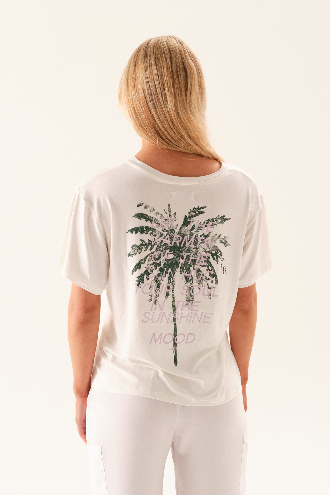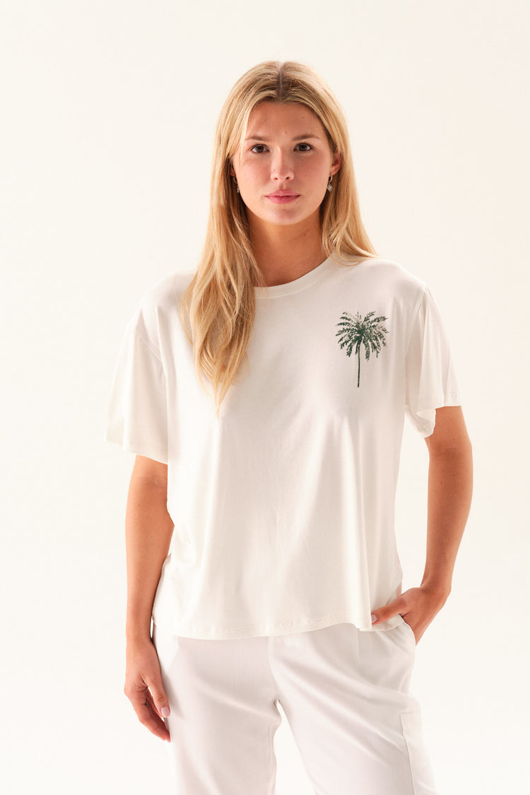 Remera de viscosa con escote redondo con manga corta y arte bordado y estampado en delantero y espalda.