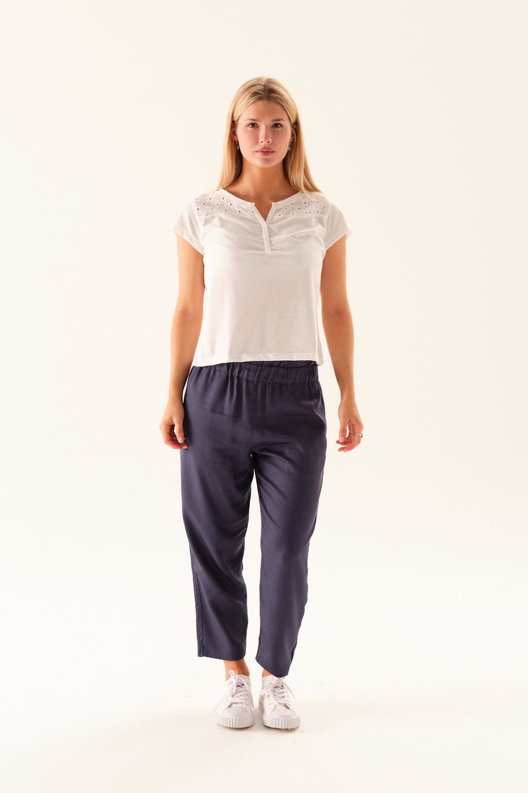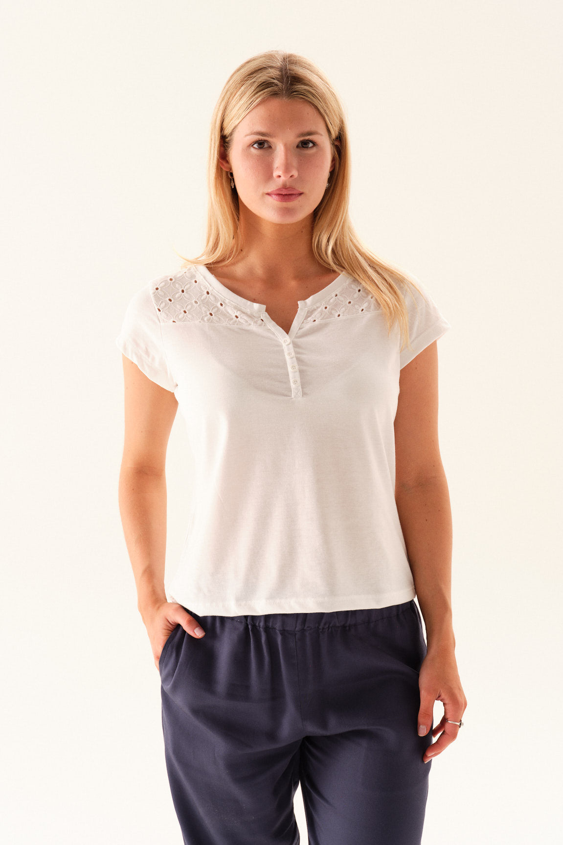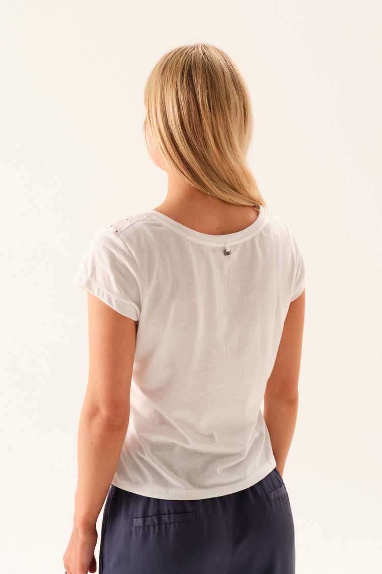 Remera escote redondo con canesú en broderie, manga corta.