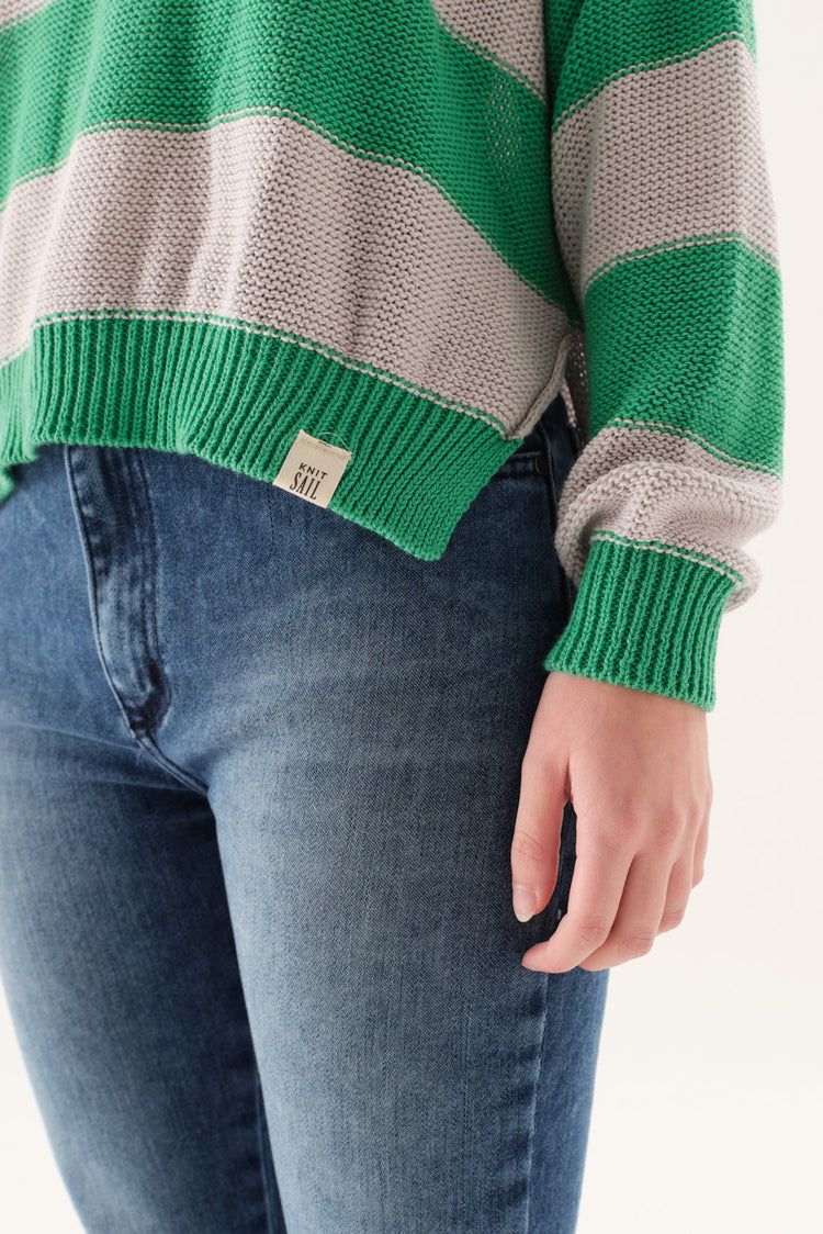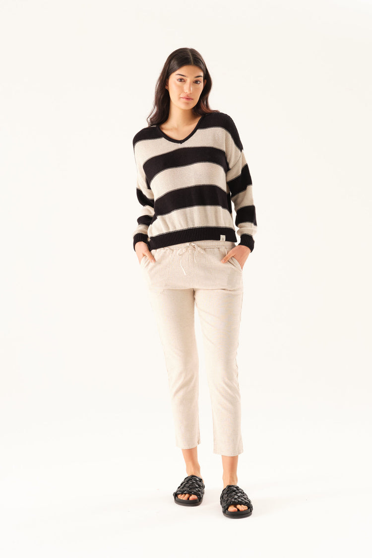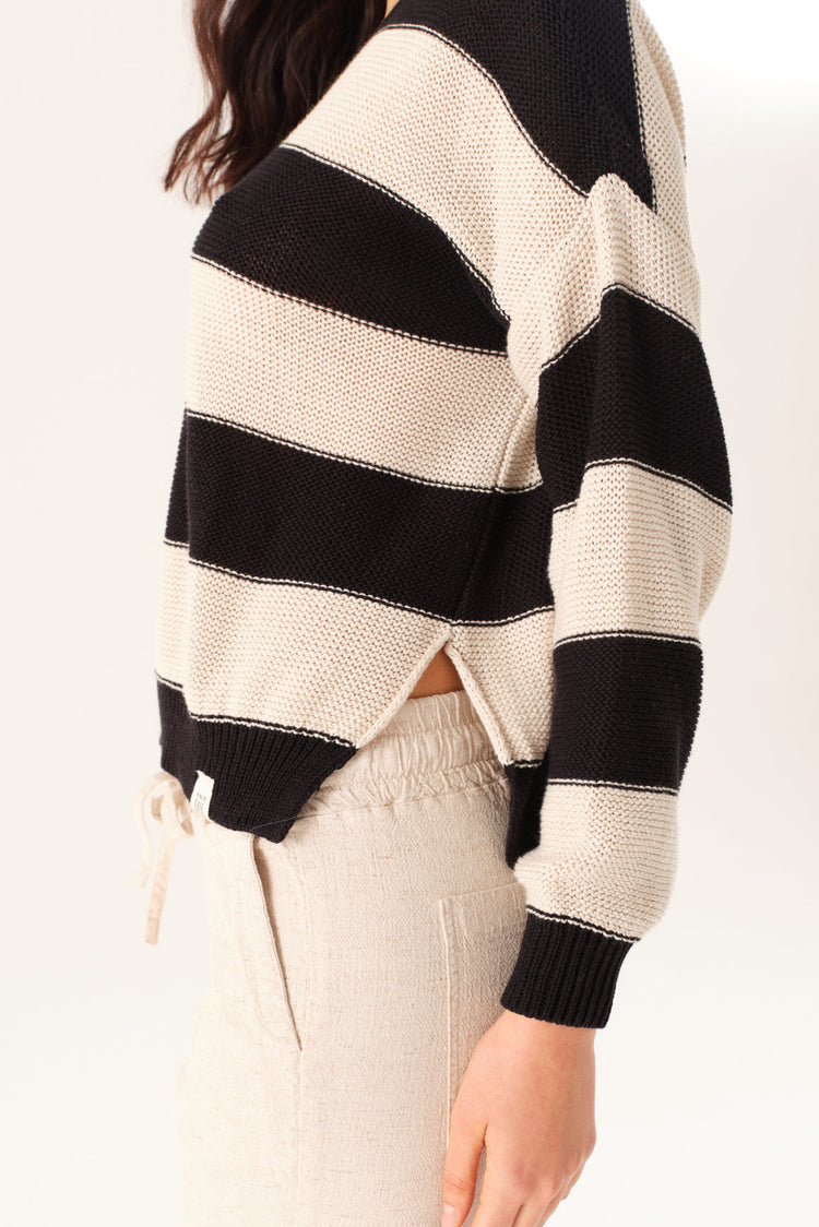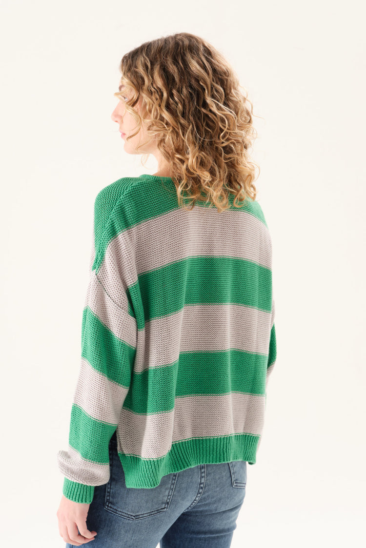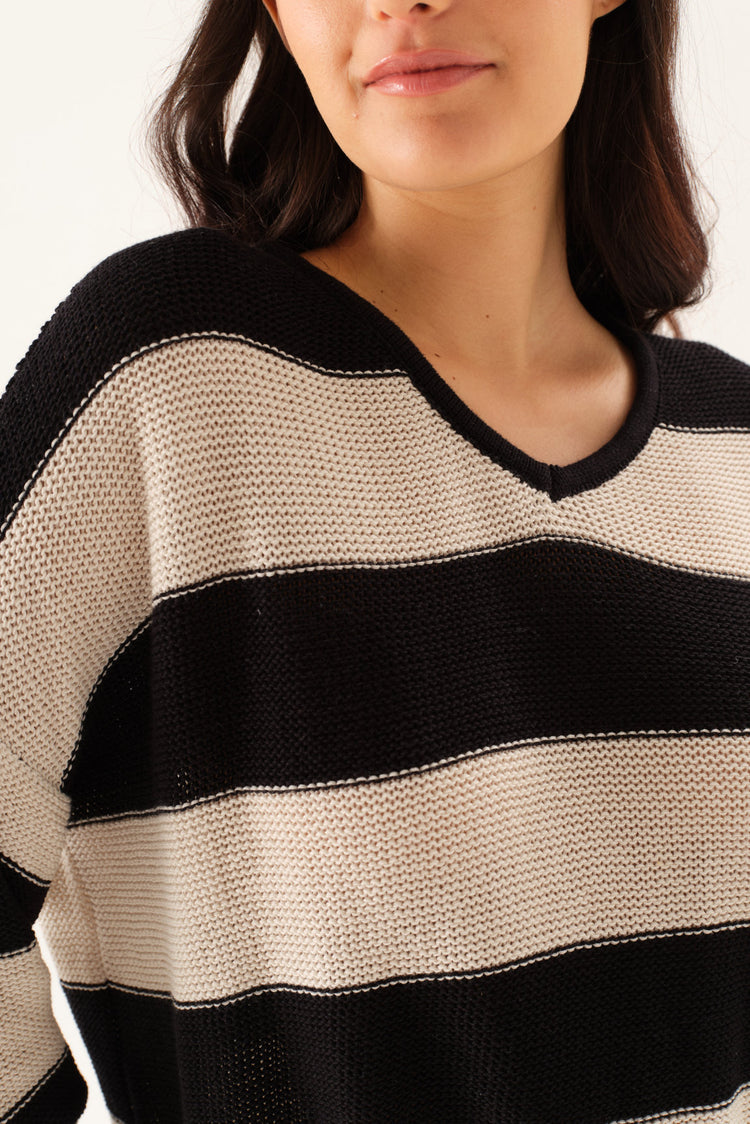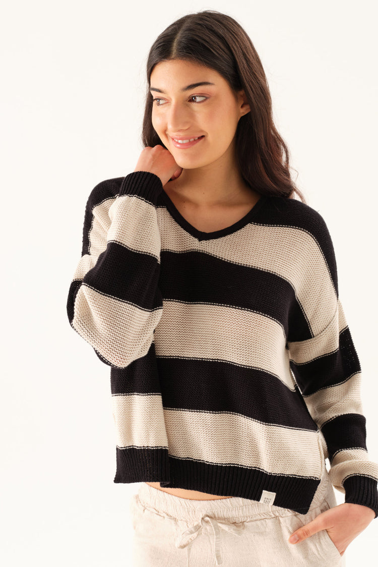 Sweater rayado de algodón con  caja cuadrada, escote en v, corte irregular, tajos laterales y puño de terminación en mangas y cintura.