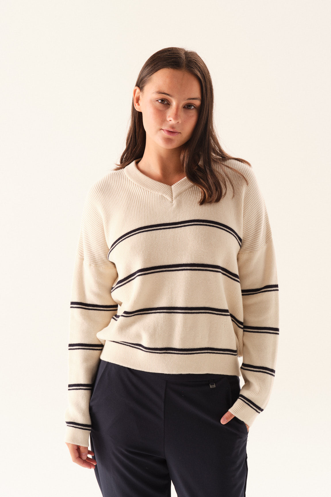Sweater de algodón, con rayas finas a contra tono, con manga caída, escote en v, con puños en terminación de mangas y cuerpo.