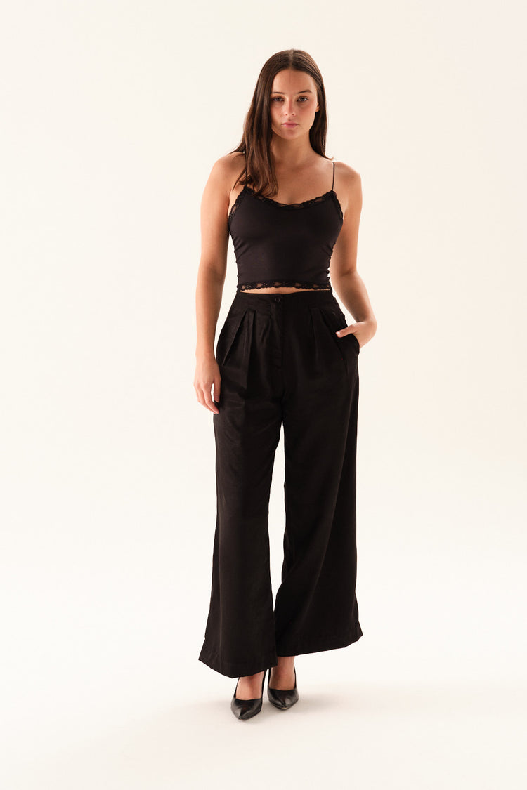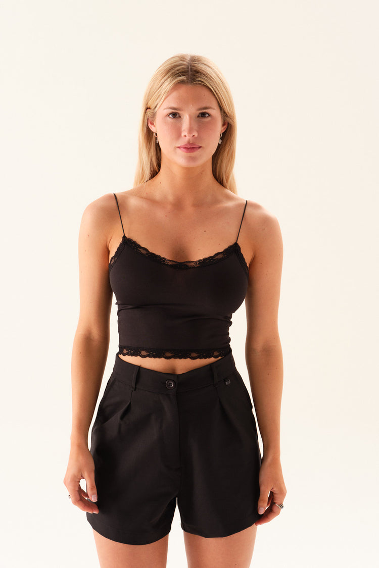 Top crop con cordón en breteles y puntilla en escote y ruedo.