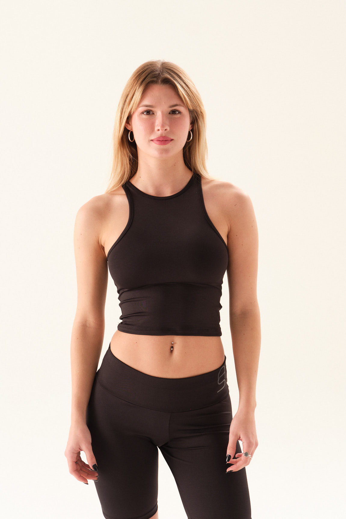 Musculosa deportiva con siza cavada y estampa en espalda.