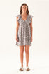 Vestido corto de jersey estampado, con volados en manga y escote en v.