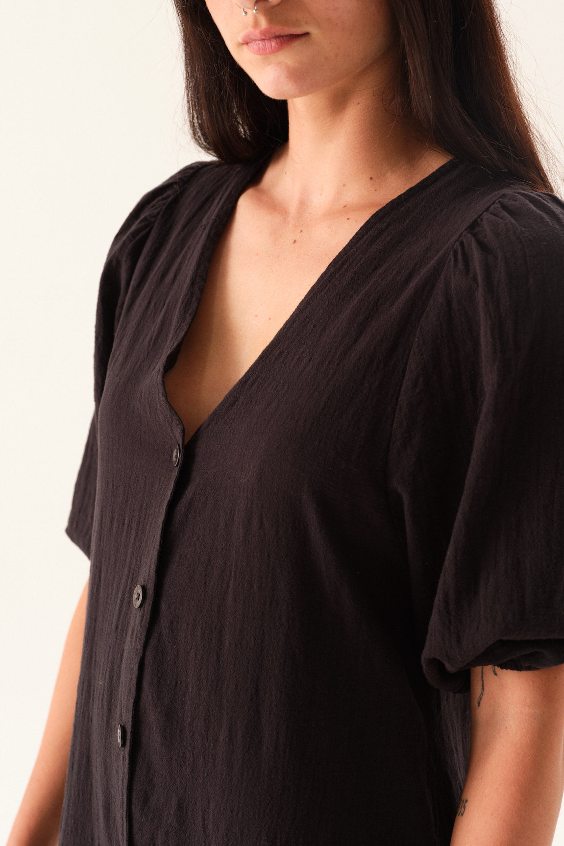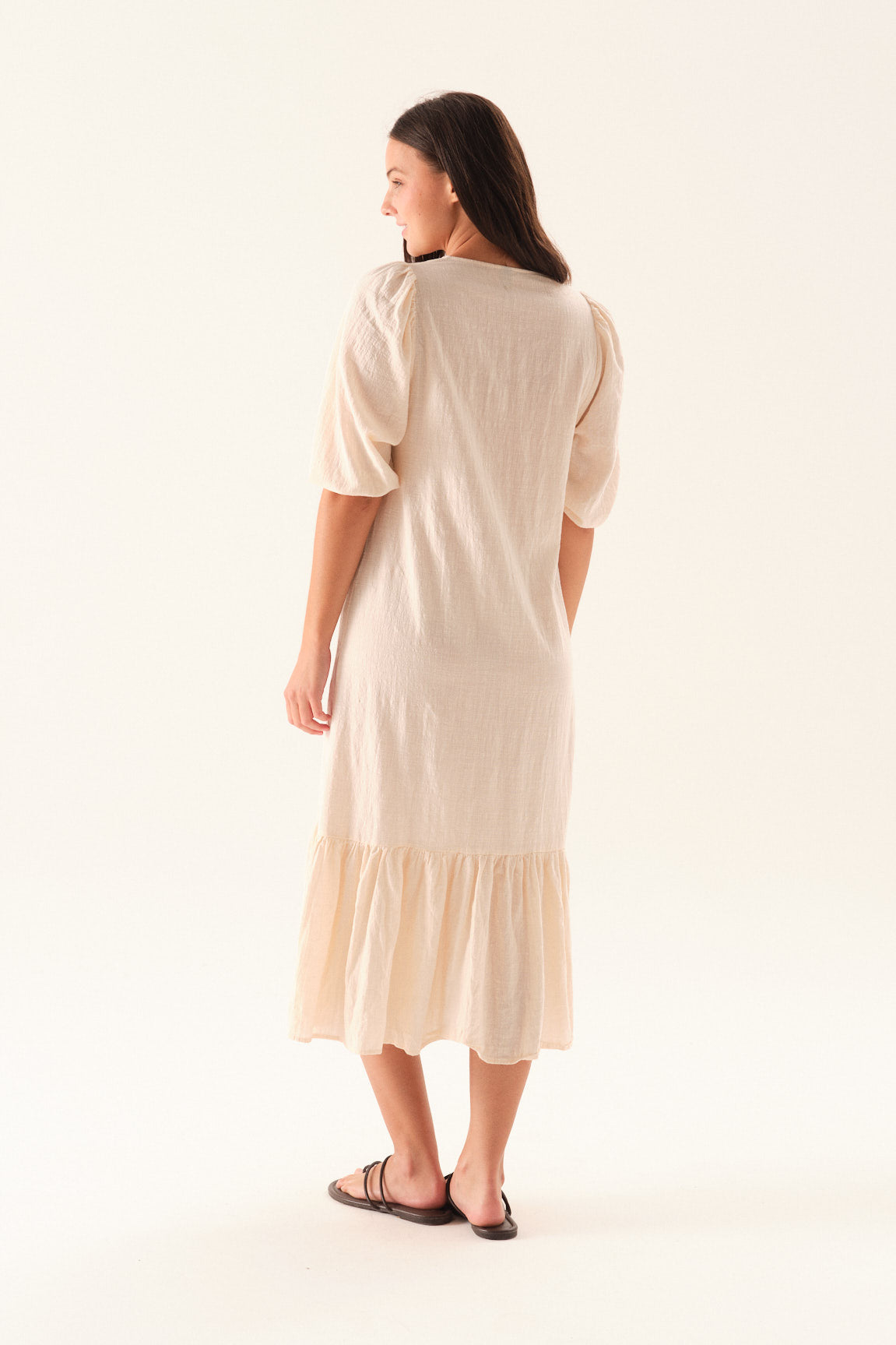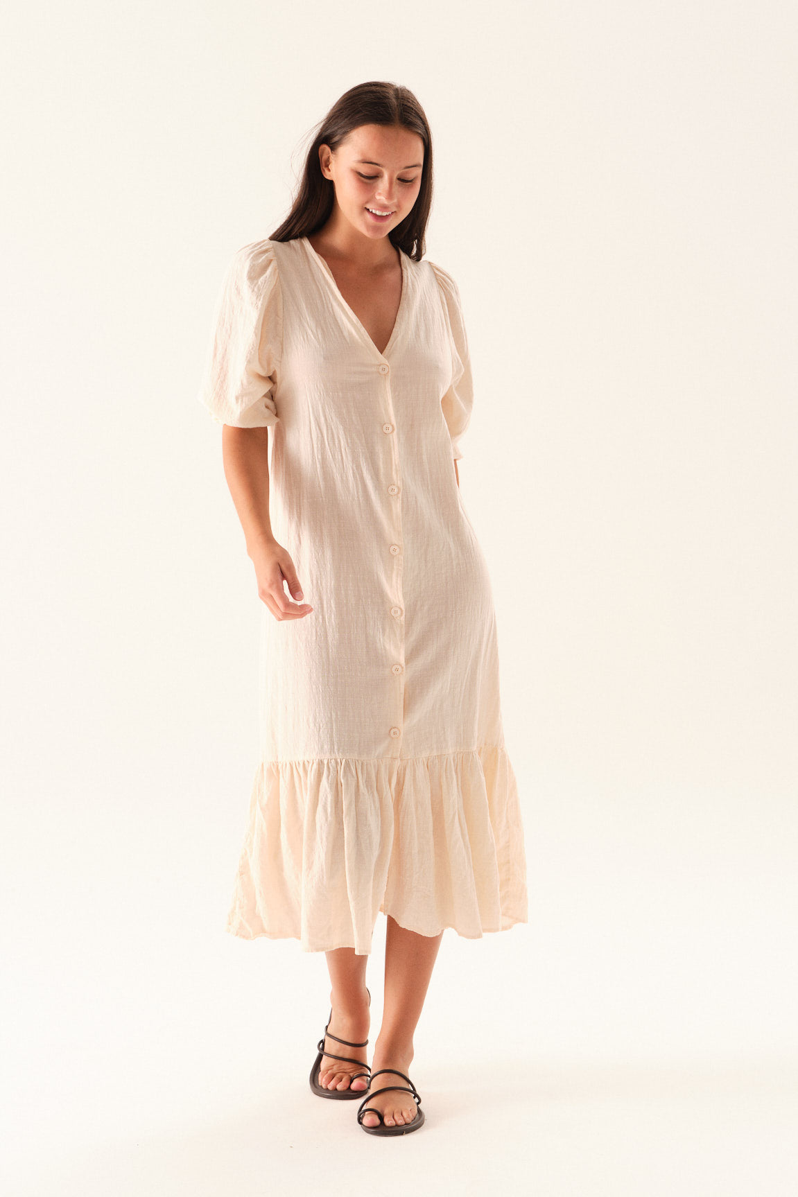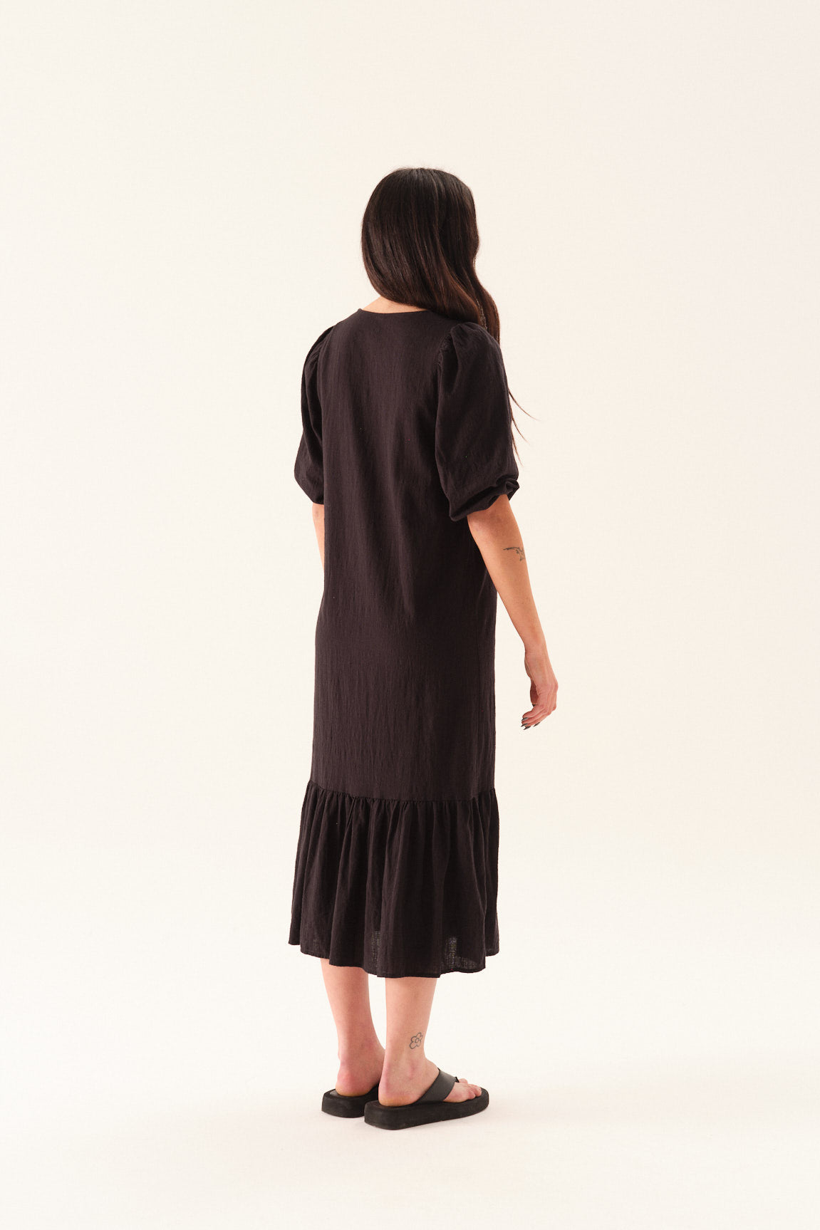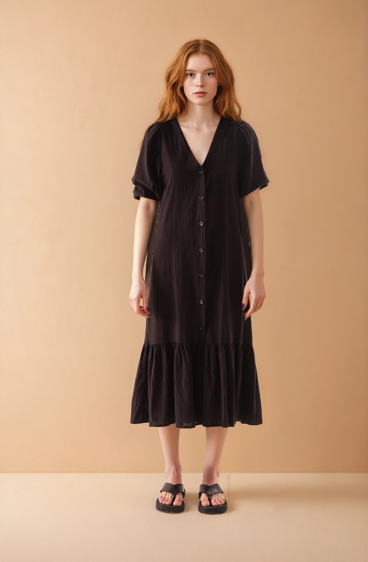 Vestido largo con manga corta balloon con elástico en puños. Posee cartera con botones en el delantero y recorte con frunces en el ruedo tipo volado.